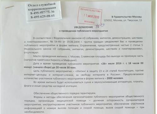 Оппозиция хотела организовать митинг на 26 июля 2016 года, против Пакета Яровой.