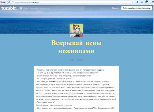 Размещающийся по адресу captainshicosnilamppost.tumblr.com блог неизвестного пользователя был включен в реестр запрещенных ресурсов Роскомнадзора за пропаганду самоубийства. Как пояснил в дальнейшем пресс-секретарь ведомства Вадим Ампелонский, основной причиной блокировки страницы стал её заголовок: «Вскрывай вены ножницами».