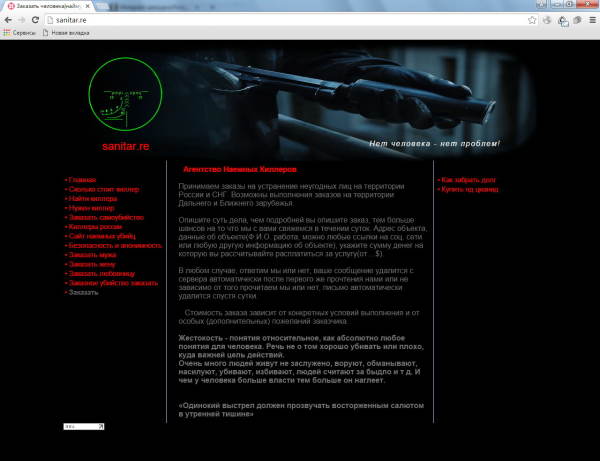 Роскомнадзор внес в реестр запрещенных ресурсов сайт, размещавшийся на домене sanitar.re, на котором предлагались услуги наемного убийцы и коллекторские услуги, а также возможность приобрести сильнодействующий яд. При этом заказчику гарантировалась абсолютная анонимность.