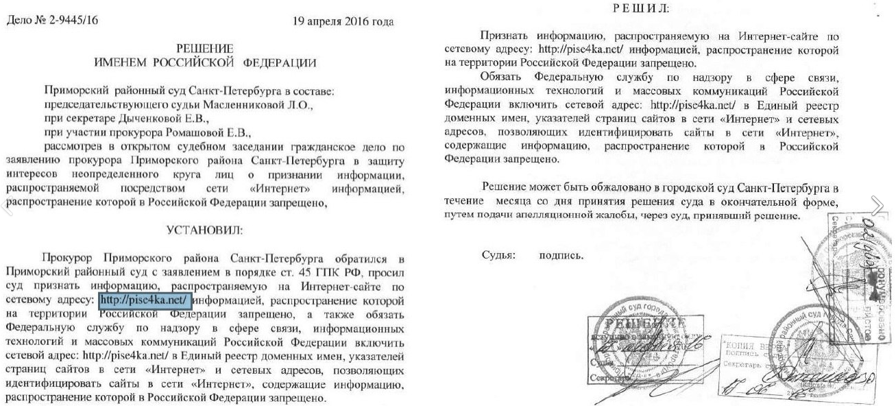 Пока что решения судов не распространяются на зеркала и владельцы порно-сайтов вполне могут обзавестись каким-нибудь простеньким зеркалом - для его блокировки нужно отдельное решение суда, а на это уйдет время.Будет лучше, если вы приедете и поговорите с нашим пресс-секретарем, я ей дам поручение — она посмотрит дело, изучит все обстоятельства, расскажет детали и прокомментирует. Дело в том, что это было в мае месяце, а я ежедневно рассматриваю по несколько процессов, и мне сложно сейчас сказать, что было и как было.