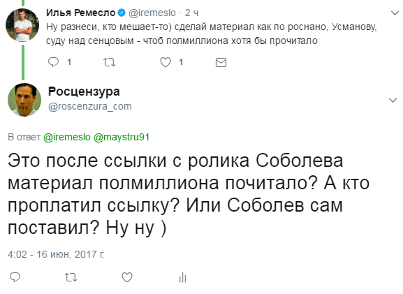 Анонимного Интернационала больше нет и некому разоблачать мурзилок. Доказать на 100%, что Соболев сотрудничает с Кремлем, невозможно, но можно сделать так, чтобы это стало очевидно для думающих людей. Наниматели Соболева его подставили, заставив разместить ссылку на известного пропагандиста Илью Ремесло.