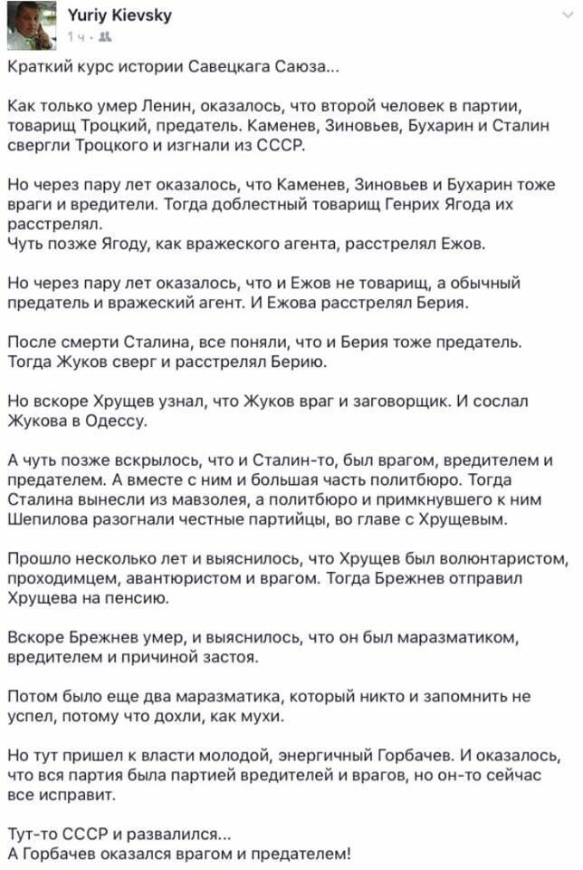 Потом, конечно, выяснилось, что Берия был преступником, и всю память о нём было приказано уничтожить. В общем, всё в точности как в одном бессмертном тексте, который описывает, как при каждом новом советском генсеке все предыдущие вместе со всем политбюро оказывались негодяями и мерзавцами: