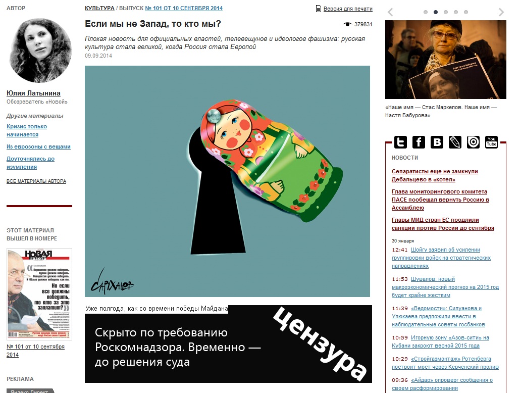 Таганский суд Москвы отказал в удовлетворении иска, поданного «Новой газетой» в отношении Роскомнадзора в связи с вынесенным изданию осенью минувшего года предупреждением за публикацию Юлии Латыниной «Если мы не Запад, то кто мы?». Тогда ведомство обосновало свои действия тем, что в статье, якобы, содержатся экстремистские высказывания.