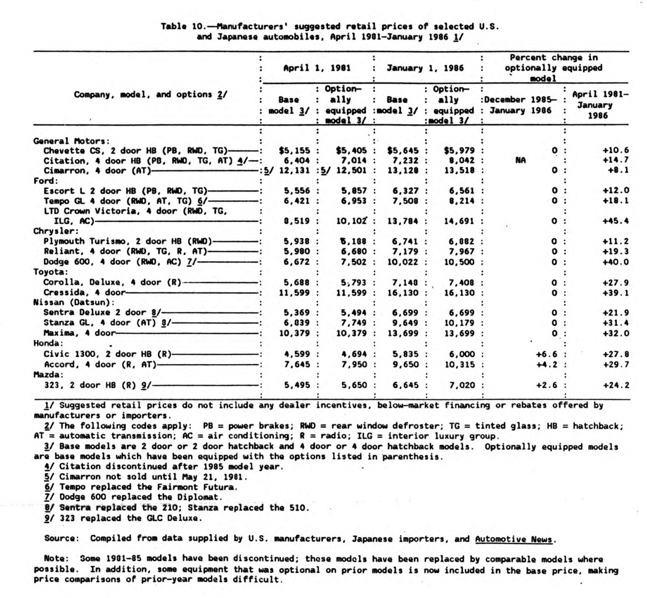 Рекомендуемая производителем розничная цена для популярных автомобилей 1981 и 1987 годов (источник).