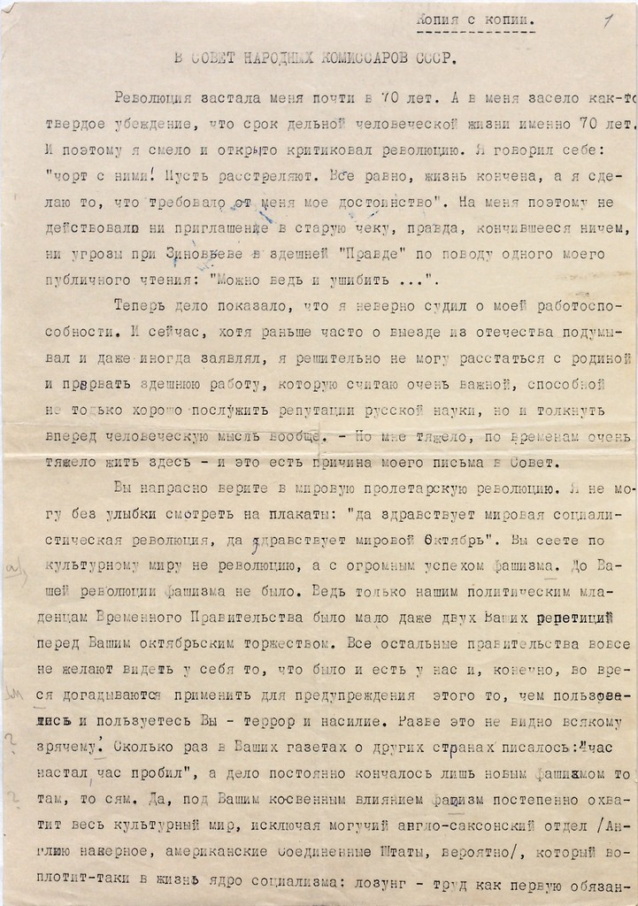 Вместе с этой частной просьбой не могу умолчать о другой теперешней несправедливости, постоянно угнетающей мое настроение. Почему мое сословие (духовное, как оно называлось раньше), из которого я вышел, считается особенно преступным? Мало того, что сами служители церкви подвергаются незаслуженным наказаниям, их дети лишены общих прав, напр., не допускаются в высшие учебные заведения. Прежнее духовное сословие, как среднее во всех отношениях — одно из здоровых и сильных. Разве оно мало работало на общую культуру родины? Разве наши первые учители жизненной правды и прогресса, Белинский, Добролюбов, Чернышевский и другие не были из духовного сословия? Разве наше врачебное сословие до революции не состояло, вероятно, на 50 процентов из б. лиц духовного сословия? А разве их мало в области чистой науки? и т.д. Почему же все они причислены к какому-то типически-эксплоататорскому классу? Я — во-первых свободный мыслитель и рационалист чистой воды, а во-вторых никогда не был никаким эксплоататором — и, будучи продуктом моей первоначальной среды, я вспоминаю однако мою раннюю жизнь с чувством благодарности и за уроки детской жизни и за мое школьное образование.