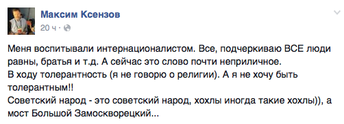 Он также заявил, что его самого нередко называют «хохлом» по месту рождения (Ксензов родился в Запорожье) и напомнил, что и раньше считал, что «администрации ресурсов, гораздо более жесткие и циничные, не ограниченные никакими рамками, нежели любые госорганы».