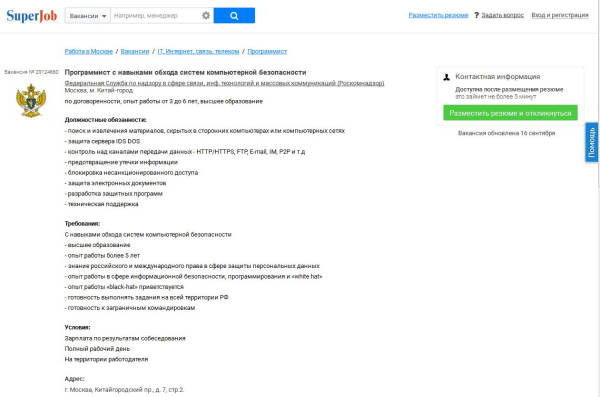 Корреспонденты «Ведомостей» обнаружили на портале Superjob весьма интересную вакансию, размещенную от лица Роскомнадзора. В объявлении ведомство приглашало на работу специалиста, имеющего навыки взлома систем компьютерной безопасности, а также ряд других специфических способностей, характерных для хакера. Примечательно, что в первоначальном варианте объявления эта должность обозначалась именно как «хакер».