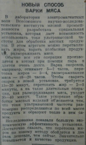 17 мая 2011 года газета «Труд» сообщила, что в её номере от 13 июня 1941 года в заметке была описана специальная установка, использовавшая токи ультравысокой частоты для обработки мясных продуктов и разработанная в лаборатории магнитных волн Всесоюзного научно-исследовательского института мясной промышленности