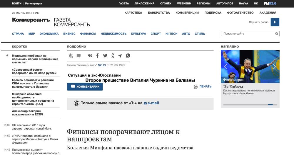 Текст статьи «Второе пришествие Виталия Чуркина на Балканы», вышедшей в газете «Коммерсант» в июне 1995 года, исчез с сайта издания после того, как оппозиционер Владимир Милов дал в фейсбуке ссылку на приведенную в заметке резкую цитату покойного российского дипломата про боснийских сербов. Затем «Коммерсант» объяснил исчезновение статьи технической ошибке.
