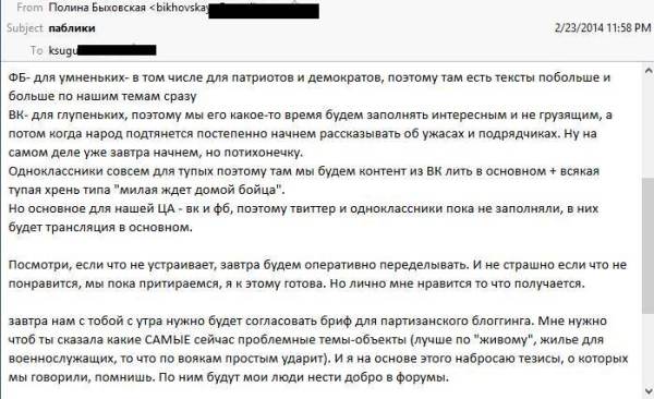 Представители группы «Шалтай-Болтай» («Анонимный интернационал») выложили в свободный доступ очередные фрагменты переписки помощницы главы Департамента строительства Минобороны РФ Романа Филимонова Ксении Большаковой. Мотивом для этого послужили высказывания представителей ведомства о том, что имеющаяся у хакеров информация не является секретной, и её при желании и до этого можно было найти в Интернете.